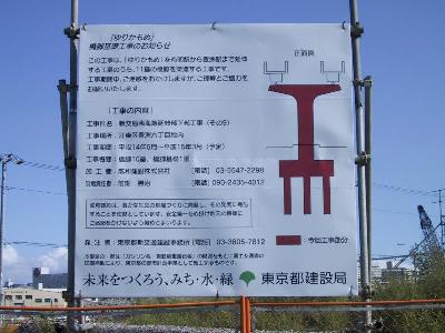 | そして、豊洲−豊洲(2)間でもこのような看板が立ちました。 平成15年3月までの予定で、10基の橋脚と1基の基礎橋脚の 計11基が作られます。 |