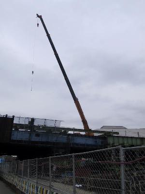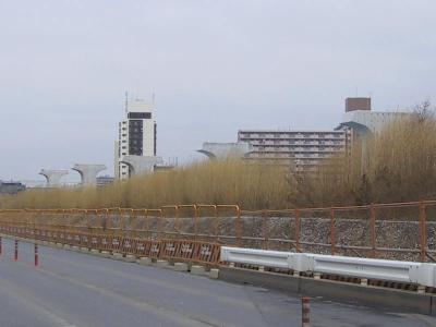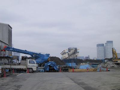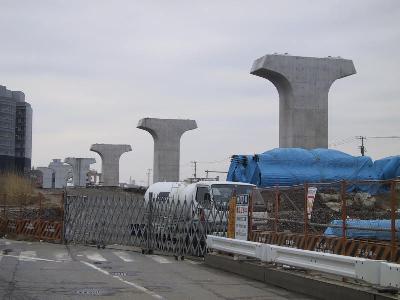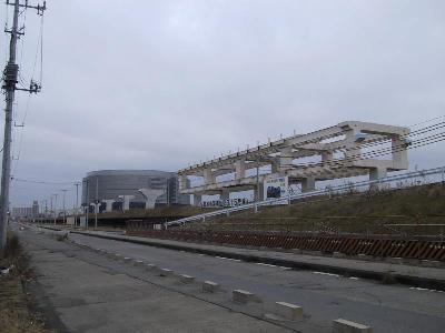 | ショベルカーや重機が入っています。 | 有明−有明北間の完成した橋脚。ここの橋脚は完成してすでに 2年近い年月が立っています。奥には有明駅が見えています。 さらに、手前に気になるクレーンがあるので早速行ってみました。 |