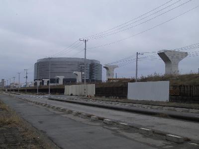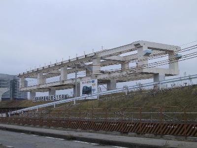 こちらは豊洲(2)駅です。この駅も今年の2月頃に現在の姿に なり、それ以降は進展がありません。 現在は豊洲−豊洲(2)間の10本の橋脚と1本の橋脚基礎の工事の 施工中です。 奥に見えているのは完成した10番目の橋脚です。 |