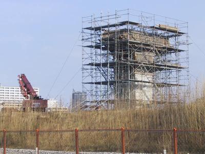 こちらは、10本の橋脚のうち、最後まで残っている7番目の橋脚です。 だいぶ形になってきましたので、まもなく完成する予定です。 |