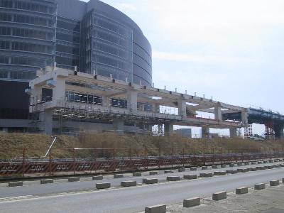 | 有明北駅 覆いが取れて、すっきりした姿になりました。 とりあえず、この段階の完成と思われます。 一番右側の部分が、豊洲(1)、豊洲(2)と形が違うところに注目です。 |