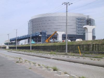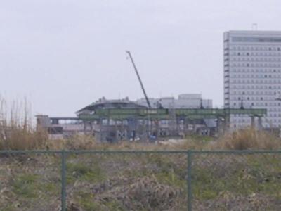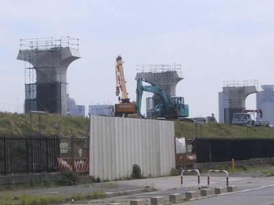 | 有明駅付近 手前の橋脚には大きな変化はありませんが、 奥の有明駅の手前で首都高を超える部分の橋脚ができてきました。 |