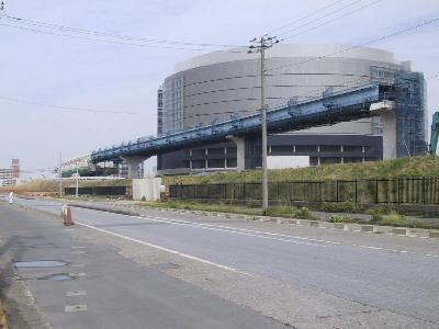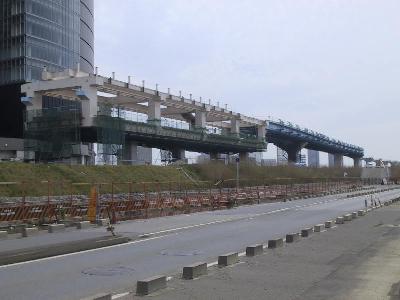少し近づいてみます。幅が広いのは、ゆりかもめと道路が一体と なってオーバーパスするからです。 |