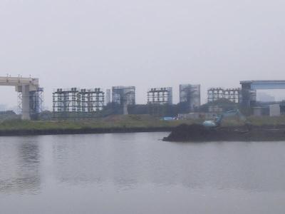 | 豊洲駅に続く橋梁はさらに伸びました。 | とりあえず、補助橋脚まで延伸されました。まもなく手前の 橋脚までつながりそうです。 |