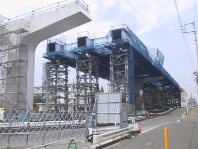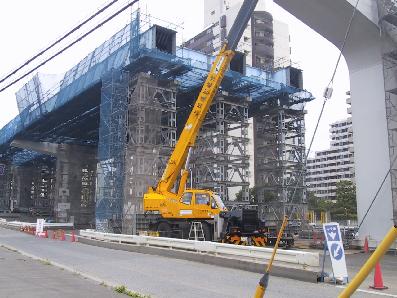 | 豊洲(1)駅 こちらも内部で工事が進んでいます。 | 豊洲(1)駅の1つ先にある橋脚です。よくみると上の部分作業員が でて作業中です。 |