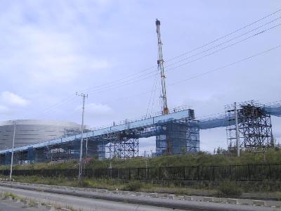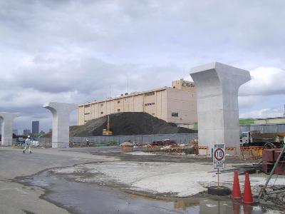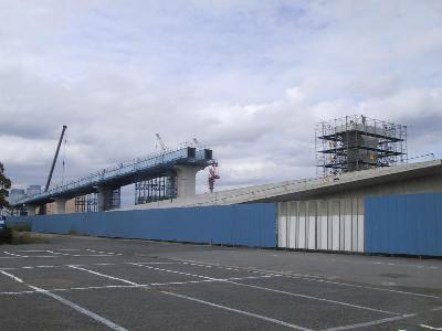 | この付近が先週より延びました。 | 右端に見えているのが豊洲(1)駅です。 まもなく、豊洲(1)駅まで橋梁がつながります。 |