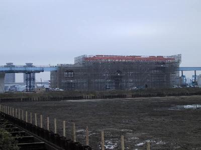 こちらも足場が組まれています。途中に上り下りする工事用の 階段も設置されました。 |