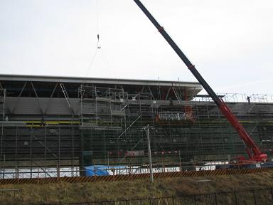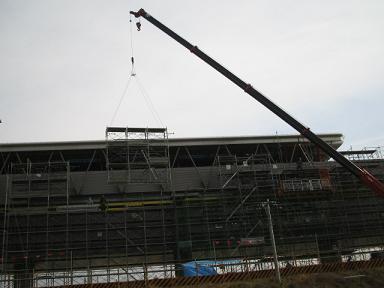 | ちょうど足場を解体しているところです。 | クレーンでブロックごとに足場が下ろされています。 |