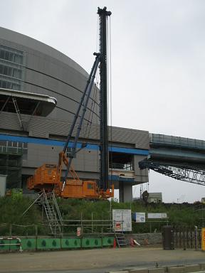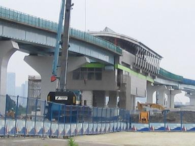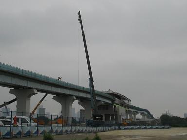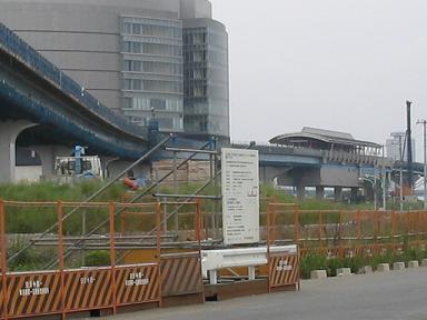 | 豊洲(2)駅 | いよいよ駅入口付近の取り付け工事が 行われるのでしょうか。 大きな重機が入っています。 |