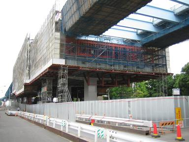 | 橋梁部分に足場が組まれ、軌道敷部分が施工されているようです。 | 駅構内部分の工事も進んでいます。 |