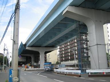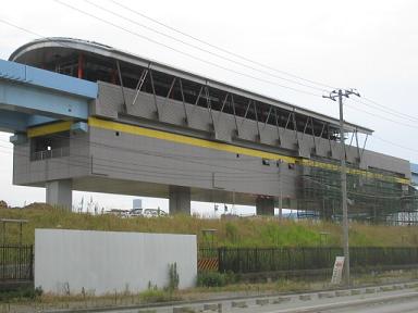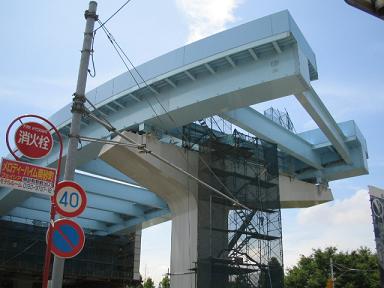 | 豊洲交差点付近。覆いが取れて、素の橋梁が現れました。 | 駅の手前部分も完成したようです。 |