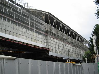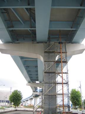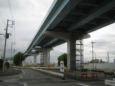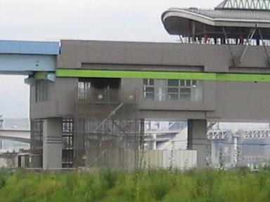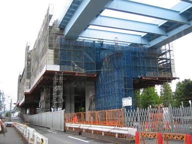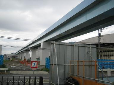橋梁の真下から見ています。 最初の頃はスケルトン状だったのですが、現在では すっかり軌道敷ができたようです。 |