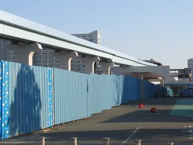 豊洲(2)方面を眺めます。 ちなみに、階段が出来る付近ですが、この近くにあった交番も移動 し、ここにバスやタクシー乗り入れる交通広場が出来ます。 また、その場所に、有楽町線への出入口も新たに設けられ、 ゆりかもめとの乗り換えもしやすくなります。 |