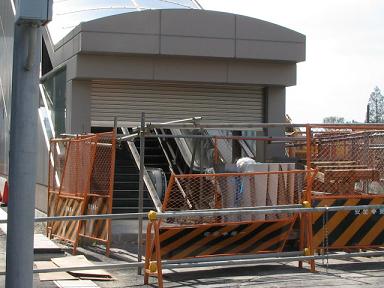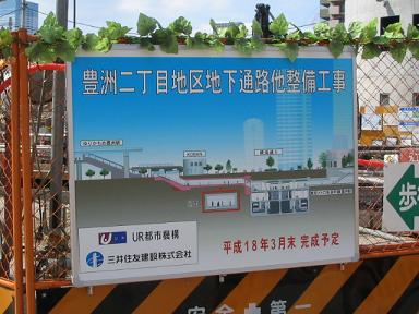 | 豊洲駅前交差点から。工事用の出入口もなくなりました。 | 階段、エスカレーターの設置も終了しています。 |