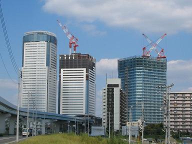 再開発でここ数ヶ月で豊洲駅付近の様子は大きく変わりました。 豊洲はいつのまにか高層ビル街になっていました。 この高層ビルの谷間にゆりかもめは発着します。 左から既存の豊洲センタービル(40F)、 建設中の豊洲センタービルアネックス(33F)、 (あともう少しだけ高くなります。) 同じく建設中のシェルタワー(40F)、 (まだ3分の2くらいの高さです。) |