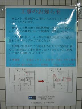 それでは、その地下はどうなってるのでしょうか。 豊洲駅の出入口にはご覧のような工事現場への入口が 設けられています。 |