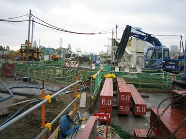 | 例によって柵の中をのぞいてみます。 深い穴が掘られており、ショベルカーも入っています。 |