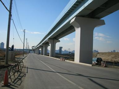 | 久しぶりにこの角度からの市場前駅です。 その先には新豊洲駅も見えています。 以前はこの場所から取材していましたが、現在は 再開発事業の真っ最中で当時の面影はほとんど なくなりました。 | |