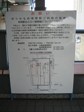 | 有明駅 | りんかい線国際展示場駅側の出入口は現在、ゆりかもめ延伸 工事と同時に進められている環状2号線の道路工事に伴い 閉鎖されています。 |