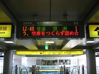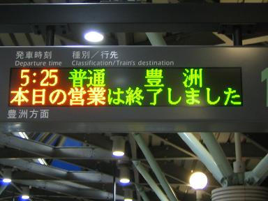 | 発車案内。下段は???です。 | これが豊洲に向けて走る1番列車ですが、テープカットや出発式が あるわけでもなく、普通の列車と変わりません。(笑) |